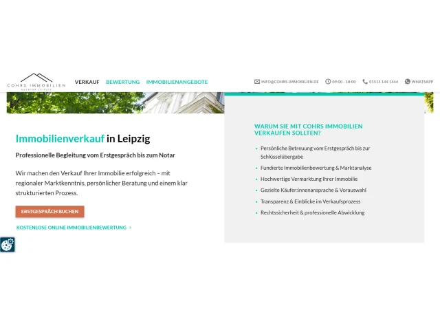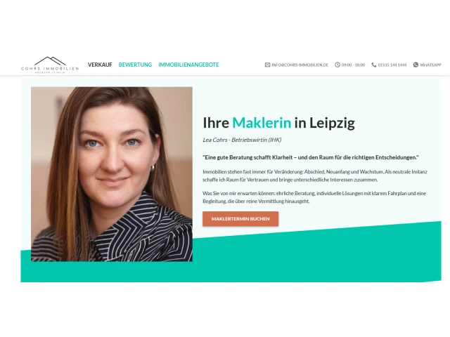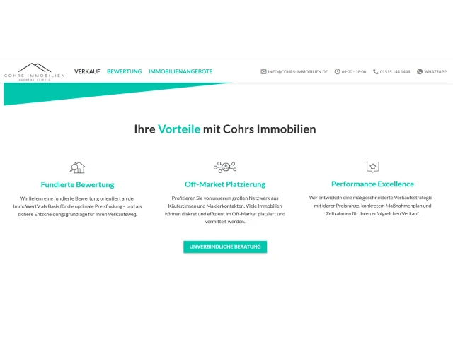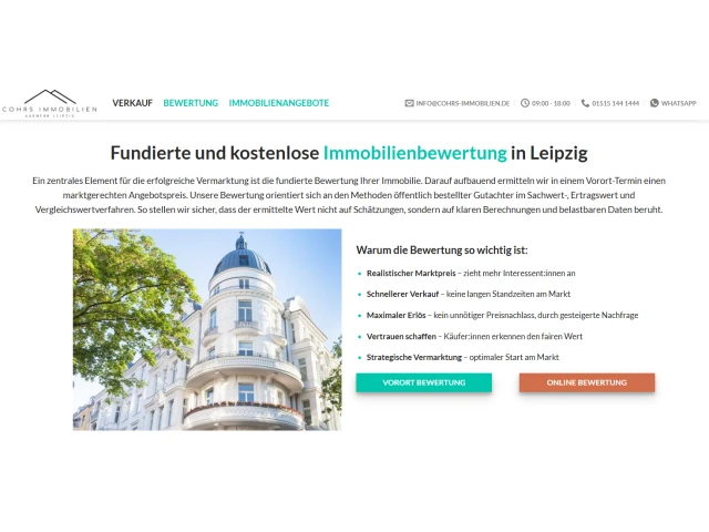 Cohrs Immobilien steht im pulsierenden Herzen von Leipzig für kompetente Beratung und exzellente Serviceleistungen rund um den Immobilienmarkt. Unsere Expertise umfasst den Verkauf und die Vermietung verschiedenster Immobilienarten – von charmanten Einfamilienhäusern, über attraktive Mehrfamilienhäuser, lukrativen Anlageimmobilien bis hin zu Grundstücken und Gewerbeimmobilien. Unser Ziel ist es, jeden Kunden und jede Kundin individuell zu begleiten und das Optimum aus jeder Vermarktung herauszuholen.